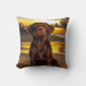Un chocolat Labrador Retriever se trouve sur une plage de sable, en regardant attentivement la caméra. La fourrure du chien est un brun riche, contrastant avec les teintes dorées du soleil couchant. Le ciel est en ébullition avec des nuages oranges et roses vibrants, reflétant dans le sable humide. Les vagues de l'océan lèvent doucement le rivage, créant une atmosphère paisible et sereine. Un cadeau idéal pour les amoureux du labrador.