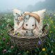 Ce design fantaisiste présente un lapin blanc irrésistiblement mignon vêtu d'une charmante salopette en denim, ornée de patchs de tissu pastel et associée à un chemisier à volants. Le chapeau de paille oversize du lapin, orné d'un ruban bleu rêveur et d'une délicate grappe de fleurs dessinées à la main, ajoute une touche vintage cottagecore. Des textures douces et peintes, ainsi que des couleurs chaudes et feutrées, renforcent l'esthétique globale cosy et nostalgique, parfaite pour ceux qui aiment les visuels doux et inspirés des livres d'histoires. Les yeux expressifs et la rougeur douce donnent à ce lapin une personnalité sincère, ce qui en fait un ajout charmant aux thèmes de nurserie, à la décoration printanière ou aux cadeaux saisonniers. Œuvre d'art générée par l