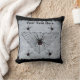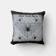 This throw pillow is white with a rustic white painted patch with a large triangle shaped black spider web with black widow spiders with red hourglass markings. Customise your text with the template on the front and back.