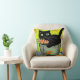 Fun accent throw pillow done dans a cartoon style graphics, with a black cat sitting in a flower pot. Great way to add a touch of whimsy and color to your room.