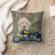 Un chien en peluche comme motard dans la nature, un coussin drôle avec deux côtés différents et des photos