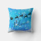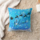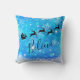 Coussin de Noël avec une silhouette noire de père Noël dans son traîneau tiré par son renne volant à travers le ciel. Croyez écrit dans une police de script tendance. L'arrière - plan est un modèle de flocon de neige glacé bleu glacé.