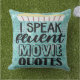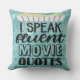 Ce coussin unique présente un arrière - plan turquoise faux parties scintillant complété par un texte unique qui dit : "Je parle des citations de cinéma fluentes" Le revers de ce coussin dit : "Mais d'abord, le chocolat", ce qui en fait un design idéal pour ce passionné de chocolat et de cinéma dans votre vie !