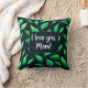 Coussin botanique élégant du jour de mère avec une encre de médias mélangés et une peinture numérique de feuille vert abstrait avec les veines vert clair au-dessus de vert-foncé, presque noires, arrière - plan. Ce coussin feuillu pour la maman d'amant de nature comporte le texte personnalisable "je t'aime, maman".
