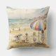 Cet oreiller est décoré d'un tableau d'aquarelle représentant des enfants jouant sur une plage de sable.