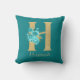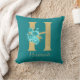 Un bel oreiller à jetons présente la lettre "H" de parties scintillant d'or avec des roses d'aqua et un bouquet de fleurs d'or sur un arrière - plan turquoise. Personnalisez avec le nom dans la police de couleur or.