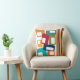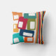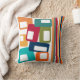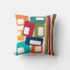 Cet oreiller de lancer a un design moderne du milieu du siècle de lignes et rectangles dans les tons rétro d'orange, or, canneberge, turquoise, vert, bleu, turquoise et vert.