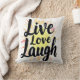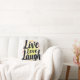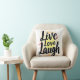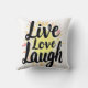 L'image comporte l'expression "Live Love Laugh" écrite en caractères gras et noirs cursifs. Le texte est placé contre un arrière - plan vibrant avec un centre jaune et rayonnant de rayures colorées dans les tons rose, orange et jaune, ressemblant à une explosion de lumière ou de feux d'artifice. Le design général est gai et stimulant, transmettant un message positif et motivant.
