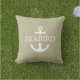 Coussin Ancre nautique. Ancre marine blanche avec nom de bateau personnalisé sur arrière - plan vert olive gris solide. Logo d'ancre moderne combiné avec le modèle de nom de bateau de police Serif classique. Ce coussin nautique kaki est une excellente idée de décoration pour les élégants coins salons extérieurs et une belle idée cadeau pour elle et lui, les plaisanciers et les marins. La terrasse décorant des idées faites avec amour pour l'océan. #ybeedesign #ybeesea #anchorpillowsnautical #boatpillows #olivegreenpillow #khakipillow © Design y.BEE SEA