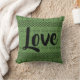 Un motif géométrique branché lance l'oreiller avec le mot Amour dans le script. Impression noire sur arrière - plan vert foncé.