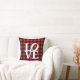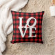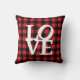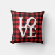 Un coussin à lancer avec un motif à plaid rustique, rouge et noir avec le mot "LOVE".