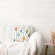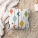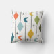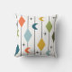 Cet oreiller de lancer a un design moderne du milieu du siècle de lignes verticales avec des diamants et des boomerangs, avec des éclats éparpillés dans l'arrière - plan.