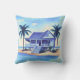 Coussin dans une charmante maison de plage avec véranda, nichée entre deux grands palmiers, face à un océan serein sous un ciel clair et lumineux.