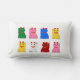 Coussin rectangulaire avec des maneki neko de différentes couleurs sur fond blanc et l'inscription Lucky cat au verso
