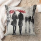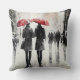 Un très bel oreiller à accent, avec une aquarelle d'une rue pluvieuse, avec un couple marchant avec des parapluies rouges.