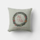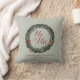 Ce coussin de Noël festif « M. & Mme » avec un mariage champêtre comprend des illustrations western dessinées à la main d'une couronne de pin avec des bottes de cowboy, un chapeau de cowboy, des baies de houx, des cactus et des ornements de Noël vintage à l'encre noire sur un fond élégant vert sauge. Personnalisez avec votre initiale de famille et votre nom pour le rendre unique.