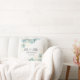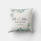 Ce coussin de mariage présente un beau graphique aquarelle de branches d'eucalyptus rehaussées de feuillage doré. Le design comprend le texte « Monsieur et Madame » dans une écriture élégante et un texte personnalisé pour le nom du couple et la date de leur mariage.