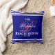 Elégante et élégante maison de plage familiale couleur marine, chalet ou toute maison de vacances monogramme décor de script jetez oreiller. monogramme couleur corail initial avec typographie blanche en gras. Il vous suffit d'utiliser la fonction "personnaliser ce modèle" pour insérer votre nom de famille, votre initiale et la date d'établissement.