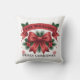 Custom double-sided throw pillow with your family name, the message "Merry Christmas", and a big red bow in the center with mistletoe, stars, and snowflakes on a white background.