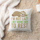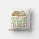 Cet oreiller à lancer a une douce paresse marron et le dicton "Je ne suis pas paresseux je travaille juste dur pour me reposer" contre un arrière - plan blanc.