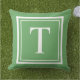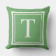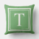 Un coussin d'extérieur classique présentant une initiale de monogramme blanc gras à l'intérieur d'une bordure de cadre carré sur un fond vert riche. La lettre serif intemporelle et le cadre géométrique épuré offrent un accent frais et prépa pour le mobilier de patio ou de jardin. L'initiale est entièrement personnalisable.
