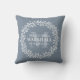 Calligraphie de couronne fleurie Typographie Monogramme Jetez l'oreiller en bleu et blanc Dusty - Élégant cadeau d'oreiller à jetons monogrammé bleu et blanc pour un couple nouvellement marié qui comprend un monogramme personnalisé, nom de mariée et de mariée, nom de famille, et modèles de date mariage entouré d'une couronne d'art floral. Un cadeau de conservation bien pensé pour la fête de ménage ou le cadeau de mariage d'un couple. ©sweetwhimsypaperie