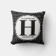 Un grand monogramme moderne en noir et blanc, en forme de cercle entouré d'un arrière - plan classique à motifs de pois noir et blanc. Personnalisez avec votre nom de famille et votre date de mariage pour un élégant oreiller à jetons monogrammé pour tout décor.
