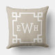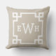 Un oreiller classique beige personnalisable avec un monogramme à trois lettres à l'intérieur d'un cadre de bordure géométrique à clé grecque blanc. Le design blanc sur beige crée un accent neutre et terreux qui convient à tous les styles de décoration. Personnalisez avec vos initiales ou le monogramme d'un couple pour un cadeau personnalisé intemporel.