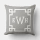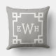 Un oreiller gris classique personnalisable avec un monogramme à trois lettres à l'intérieur d'une bordure géométrique clé grecque blanche. Le design blanc sur gris crée un accent raffiné et polyvalent pour n'importe quelle pièce. Personnalisez-le avec vos initiales ou le monogramme d'un couple pour un cadeau de pendaison de crémaillère ou de mariage attentionné.