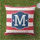 Un coussin de plein air patriotique présentant une initiale de monogramme personnalisable dans un cadre de cercle marine avec des accents d'étoiles et de rayures rouges et blanches sur un fond blanc. Le design classique de monogramme américain est parfait pour le 4 juillet, la fête des morts ou pour une décoration de porche patriotique toute l'année. L'initiale est entièrement modifiable pour personnaliser avec la lettre de votre nom de famille.