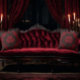 Ce coussin de jet gothique ou d'académisme sombre a un motif damassé de couleur rouge et noir.
