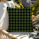 Un oreiller extérieur amusant et mignon avec un motif en plaid classique noir et vert à damiers sur arrière - plan burlap. Décor rustique unique et élégant, avec accent pour décorer la véranda avant ou la cour de votre maison de campagne, cabine en bois, chalet de montagne, camp de pêche, lac ou maison de vacances en rivière.