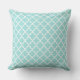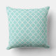Le design carré accent coussin dispose d'un élégant motif graphique marocain quatrefoil. Les couleurs sont blanches et aqua / bleu oeuf de robin