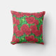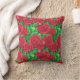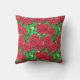 Jetez l'oreiller dans un motif de roses aquarellés, dans les nuances de cramoisi profond au rouge rose, contre un arrière - plan de feuilles verts