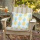 Un coussin extérieur tropical présentant un motif répétitif de ananas vert menthe et jaune sur fond blanc. La palette de couleurs pastel douces apporte une touche tropicale fraîche et aérée aux meubles de patio, aux chaises au bord de la piscine ou au mobilier de la véranda. Un coussin d'été apaisant qui se marie bien avec la décoration extérieure de style côtier et de maison de plage.