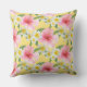 Le design coussin de style tropical est orné d'un motif de fleurs d'hibiscus roses, jaunes et blanches aux couleurs arrière - plans jaunes.