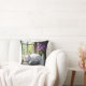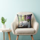 Add a relaxing vibe to your room with this pretty colorful throw pillow featuring a white fluffy cat napping on a rustic window sill next to a pretty vase of vibrant purple flowers.