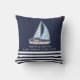 Coussin nautique moderne personnalisé pour une maison de lac, de plaisance ou de plage avec illustration de voilier, bandes et texte modèle pour customiser avec votre nom de famille, année établie ou autre texte.