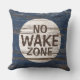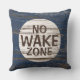 Coussin extérieur vintage avec NO WAKE ZONE citation texte sur un blanc lave gris brun patiné planches de pont de bateau en bois motif. Fait pour le marin, le bateau, le sport nautique, la navigation, la voile, l'océan ou les amoureux de la mer. Joli, amusant, classe et des éléments de décoration à la mode pour ceux qui aiment décorer le patio, la véranda, le pont ou le quai de leur maison de vacances de rivière, la maison de plage, le chalet de lac, RV ou camping-car, bateau ou yacht avec des accents et accessoires de décoration inspirés du thème maritime.