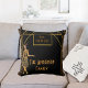 Un coussin de style art déco en faux or et noir pour une décoration glamour. Décoré avec une fille à flapper de style années 1920 et un cadre art déco. Modèles pour votre nom de famille, et date/date mariage établie.