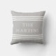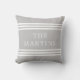 Ce coussin simple et élégant comporte un arrière - plan gris doux avec les rayures blanches élégantes et votre nom de famille au centre.