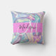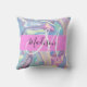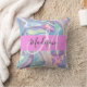 Nom monogramme irisé holographique rose, aqua et turquoise, et oreiller de lancement initial. Votre nom personnalisé et votre monogramme sont écrits dans un élégant script écrit à la main avec un arrière - plan rose. Un cadeau d'anniversaire ou de Noël parfait !