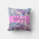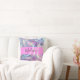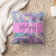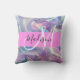 Nom monogramme holographique irisé rose, violet et aqua et oreiller de lancement initial. Votre nom personnalisé et votre monogramme sont écrits dans un élégant script écrit à la main avec un arrière - plan rose. Un cadeau d'anniversaire ou de Noël parfait !