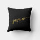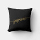 Oreiller personnalisé minimaliste, simple et élégant avec monogramme en noir et or. Ces créations présentent votre prénom dans une jolie typographie (ou calligraphie) à la main avec un effet de queue en arabesque en noir et or. Celles-ci sont faciles à personnaliser. Cadeau de pendaison de crémaillère élégant et féminin, également pour un anniversaire, la fête des mères, une fête d'anniversaire pour les 16 ans, un mariage, une douche de mariée, une baby shower, pour un diplôme et c'est pour la fille qui aime les choses uniques et élégantes.