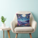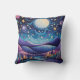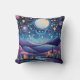 Un coussin avec une belle illustration. L'ambiance fantaisiste et fantaisiste. Une grande lune brillante avec des étoiles tout autour. Perché sur un beau paysage d'arbres, de montagnes et d'une rivière sinueuse. Impressionnant mystique magique.