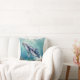 A oceanic themed pillow with a beautiful illustration of an impasto style whale swimming deep in the sea by vibrant colorful coral. A really beautiful coastal art. Colors used are teal, blue and soft coastal colors.