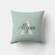 Oeufs de canard Monogramme vert Script Jeter oreiller, chaque côté du coussin dispose d'un monogramme blanc initial et d'un nom vert émeraude foncé, sur un arrière - plan de couleur oeuf de canard. Le coussin est facile à personnaliser en tapant le nom et le monogramme initial de votre choix dans le modèle de personnalisation en ligne avant de commander. Le texte se copie automatiquement de l'autre côté du coussin pour afficher le nom et l'initiale identiques de chaque côté.