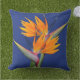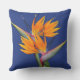 Des fleurs tropicales jettent de chaque côté de l'oreiller des fleurs oranges d'oiseaux de paradis. Couleur bleu marine avec deux fleurs de chaque côté. L'image du deuxième côté est retournée. Choisissez un tissu intérieur ou extérieur et une taille coussin. Cette conception permettra d'égayer n'importe quelle maison de plage ou de location côtière.
