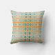 Cet oreiller de lancer a un design géométrique de lignes dans les tons turquoises et orange tressés pour faire un plaid.