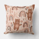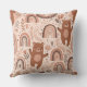 Un oreiller décoratif avec un motif de nurserie seamless de style bohème charmant et doux, présentant des ours en peluche marrons adorables dans des poses ludiques, associés à des arcs-en-ciel boho chaleureux et arqués décorés de cœurs et d'accents pointillés. Conçu dans un style moderne inspiré de la Scandinave, l'illustration utilise des tons chauds et feutrés de marron, taupe, beige et rose blush sur un fond neutre clair, créant une esthétique neutre et apaisante